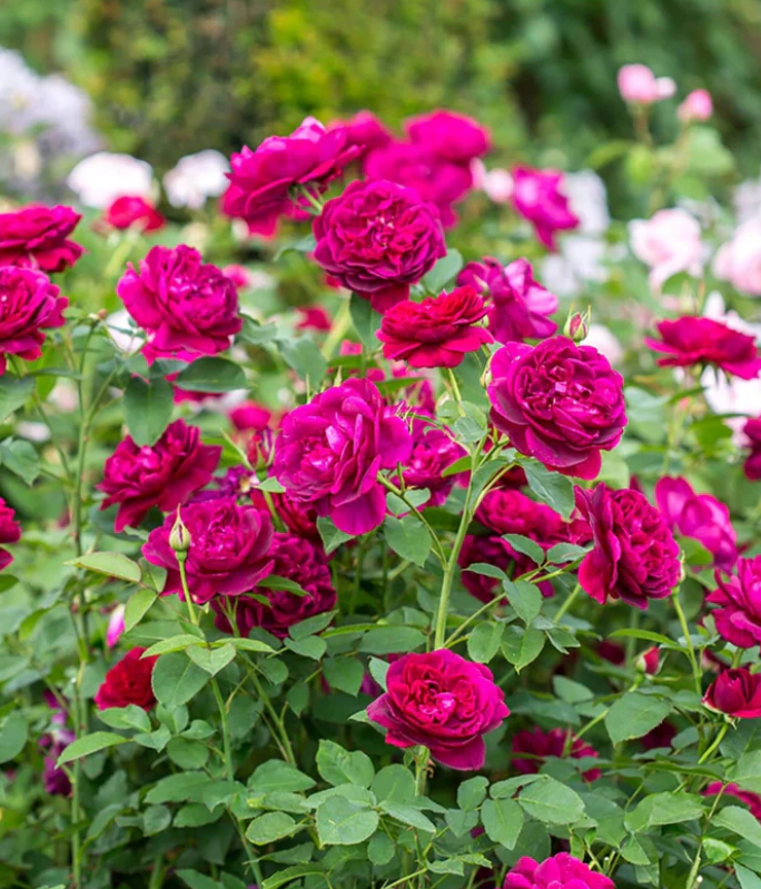 Роза парковая Дарси Бассел — это великолепный сорт, который поражает своей красотой и изяществом. Её цветки имеют насыщенный красный цвет с малиновым оттенком. Они собраны в пышные соцветия и имеют диаметр около 10–12 см. Лепестки слегка волнистые, что придаёт цветкам особый шарм.