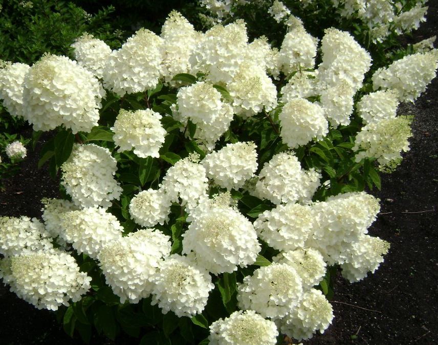 Гортензия метельчатая Сильвер доллар – мощный многолетний кустарник под 2 метра высотой с аналогичным по диаметру охватом кроны. Растение имеет прямые, крепкие побеги, покрытые темно-коричневой корой, и продолговатые, остроконечные листья темно-зеленого оттенка, оснащенные зубчатыми краями. Крона у Сильвер доллар округлой формы. Этот сорт славится своими соцветиями. В данном случае они крупные, сначала воздушные и легкие, в дальнейшем – плотные, с характерной конусовидной вершиной. Цветки собраны в пирамидальную метёлку 20–27 см длиной, 9–18 см шириной. Каждое соцветие состоит из множества стерильных, белых как снег, цветков, которые, будучи бутонами, радуют глаз нежным зеленоватым тоном. К сентябрю они приобретают розоватую окраску или бледно-сиреневый оттенок. Цветение культуры продолжается с июля по октябрь. Несмотря на внушительные размеры, соцветия не создают особой нагрузки на побеги, и те остаются направленными вертикально вверх в течение всего периода цветения. Подвязывать сорт не требуется.