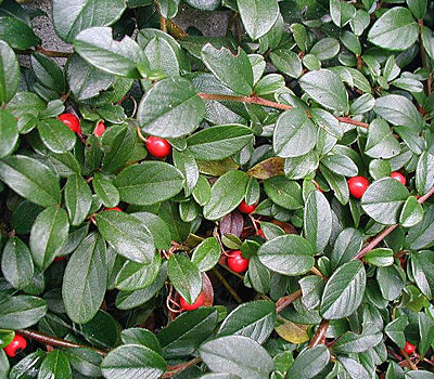 Лист кизильника горизонтального почти круглый, кончик немного вытянут. Длина листа чуть больше одного сантиметра. Листья на кустарнике плотные, насыщенного зеленого окраса и блестят. Осенью листья меняют свой окрас и приобретают красный оттенок.