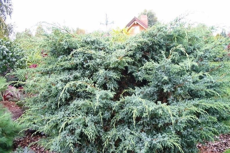Можжевельник чешуйчатый Мейери - это популярная и особенно предпочитаемая садоводами декоративная форма. В молодом возрасте растение ветвится довольно густо. В зрелом состоянии представляет собой кустарник высотой от 2 до 5 метров. Побеги прямые, веточки короткие и компактные. Хвоя имеет игольчатую форму, достигает 6-10 мм в длину и около 1,5 мм в ширину, насыщенно расположена и обладает выраженным серебристо-голубым оттенком, особенно ярким в конце мая и в июле. Годовой прирост может составлять до 10 см. Это растение было завезено в Европу в 1914 году. Рекомендуется для озеленения садов и успешно адаптируется к городским условиям, включая жару. Также хорошо реагирует на обрезку.