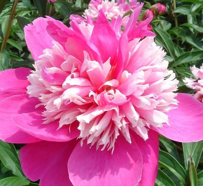 Этот пион выделяется уникальной красотой своих цветков, обладающих пышными махровыми лепестками в пурпурно-розовых тонах с белоснежными штрихами, раскрывающимися во всей красе.
