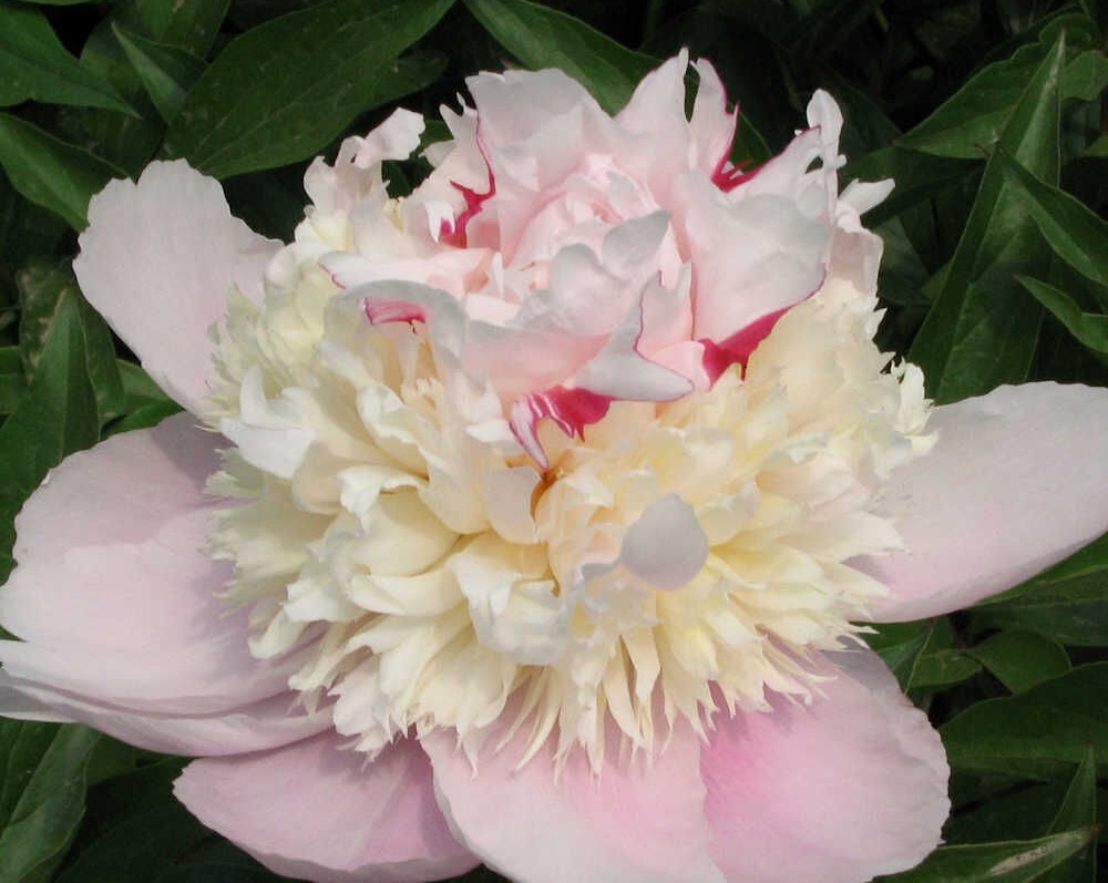 Цветки в диаметре до 12 см, окрашены в три тона: кремовый, бледно-розовый и ослепительно белый. Розовые штрихи добавляют этому пиону особую нежность и изысканность.