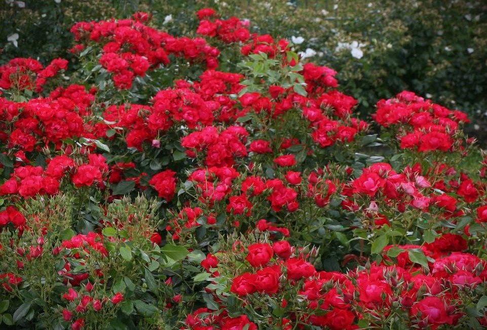 Он отличается ярко-красными цветками с полумахровыми лепестками. Диаметр цветков составляет 4–6 см.