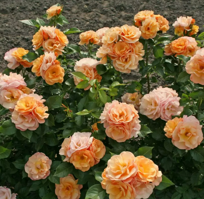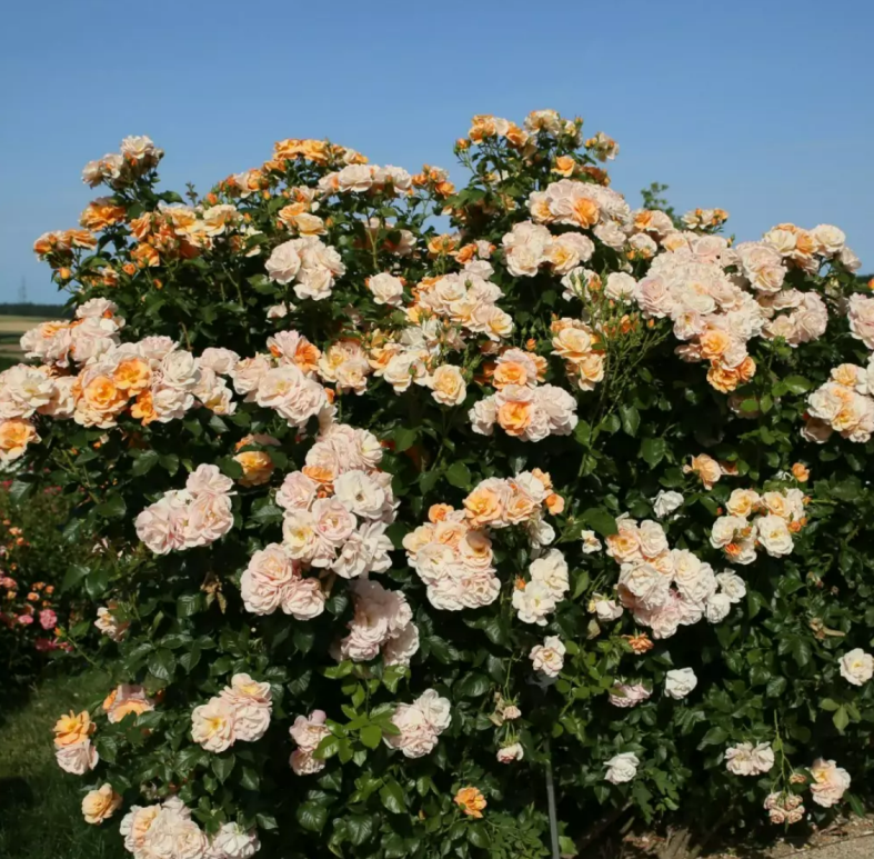 Он характеризуется полумахровыми нежно-персиковыми цветками, которые обильно покрывают кусты во время цветения.