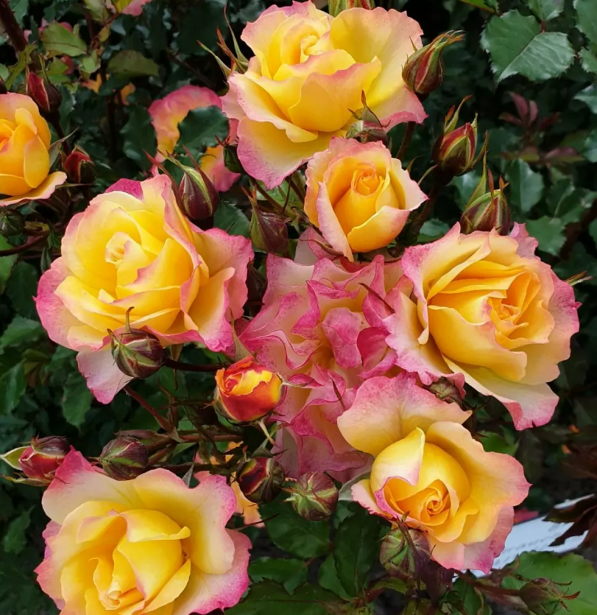 Этот сорт имеет ярко-жёлтый окрас с розовыми краями лепестков.