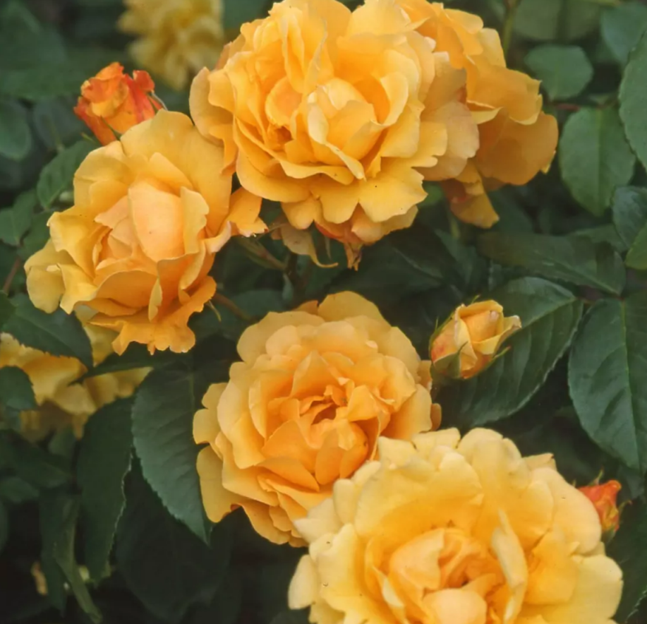 Цветы 'Postillion' – настоящее сокровище сада. Медно-желтые, густомахровые бутоны, достигающие 10-12 см в диаметре, собраны в изящные соцветия, создавая ощущение света и торжества. Их насыщенный аромат наполняет пространство сада волшебными оттенками свежести и тепла.